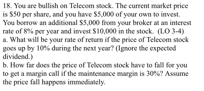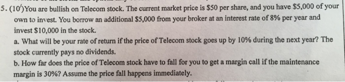 8. You are bullish on Telecom stock. The current market price is $50 per share, and you have $5,000 of your own to invest. You borrow an additional $5,000 from your broker at an interest rate of 8% per year ... View This Document